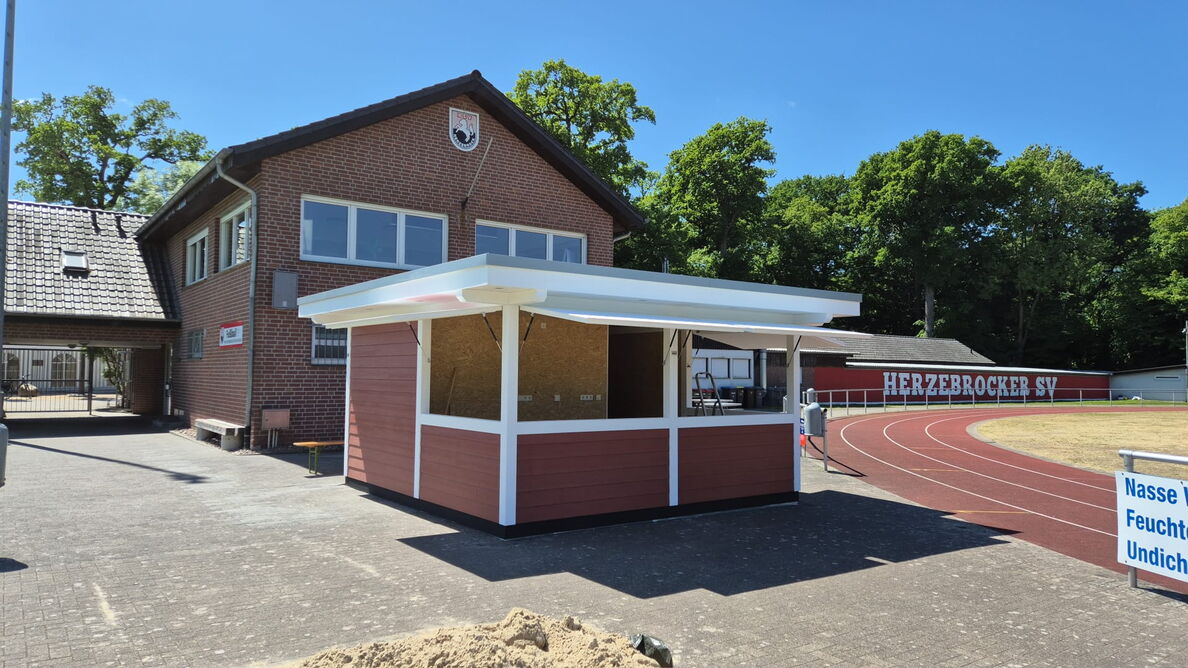 Unser örtlicher Sportverein hat im Jahr 2025 sein 100-jähriges Bestehen gefeiert (ein sehr gut besuchtes und gelungenes Fest, soweit ich mich erinnern kann 😉) und zu diesem besonderen Anlass haben wir uns entschieden, den bereits lange geplanten Verkaufsstand zu sponsern. Das gesamte Material und der Zuschnitt wurden von uns übernommen, die Fertigung und die Montage wurden ehrenamtlich von den Mitgliedern unter Federführung unseres Kollegen Reinhard Kofortschröder ausgeführt, mit einem Ergebnis was sich sehen lassen kann.