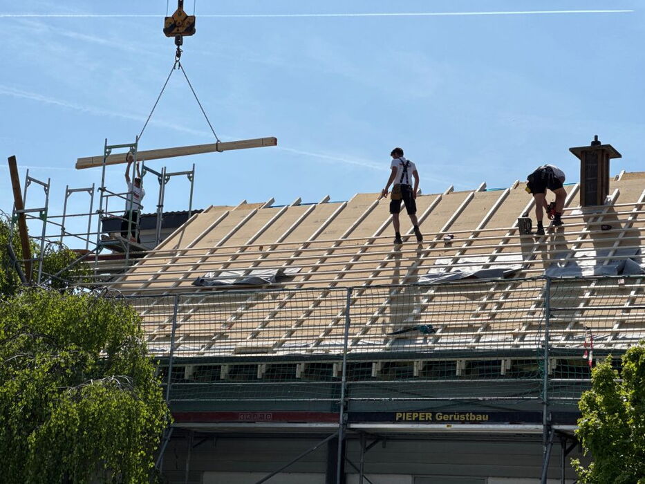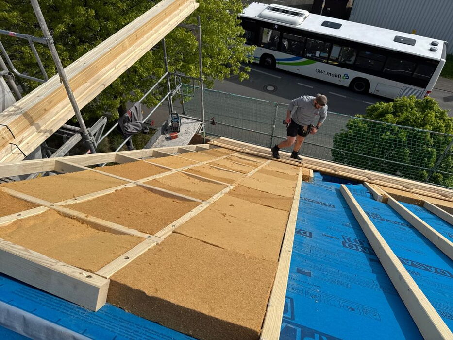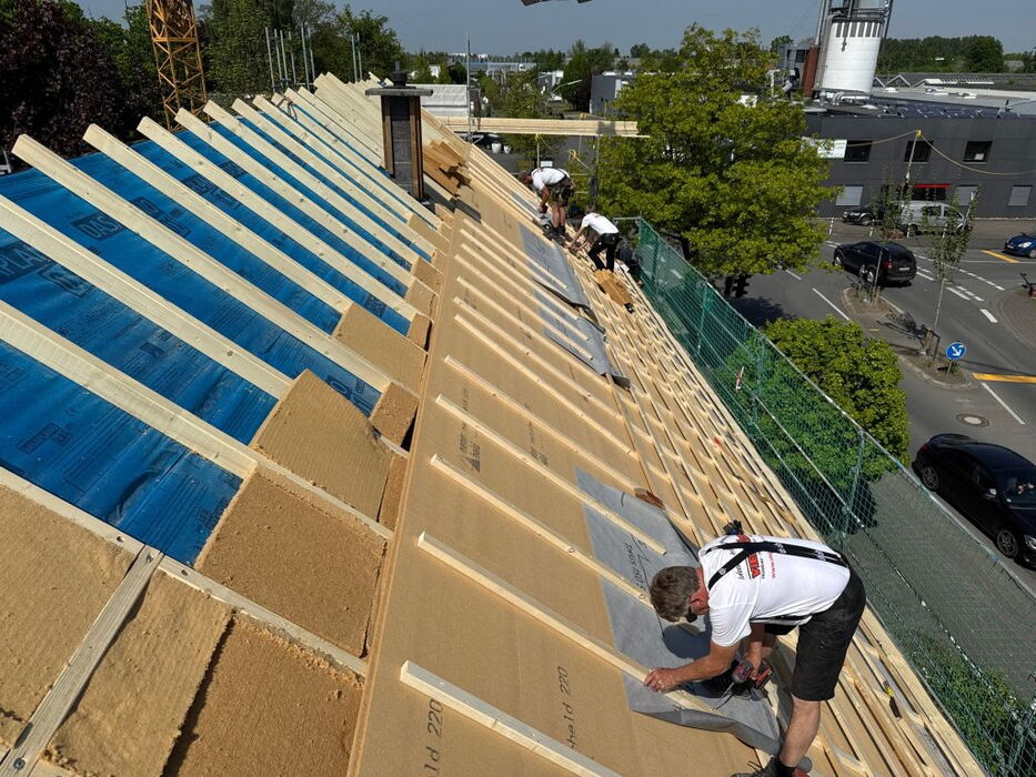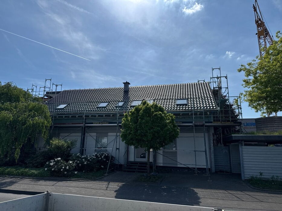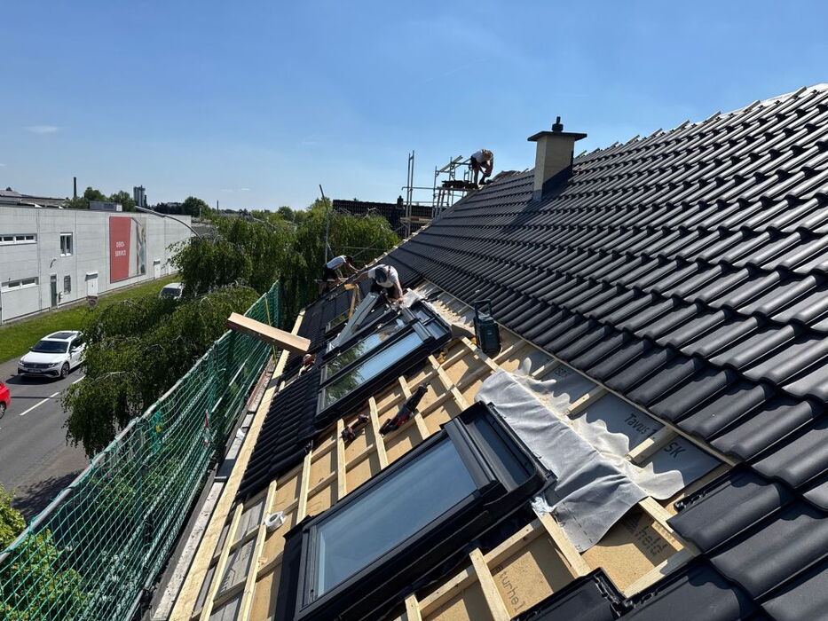 - Dachsanierung von außen (Erhöhung der konstruktiven Sparrenhöhe und damit auch der Dämmung zusammen mit einer Neueindeckung des Daches)